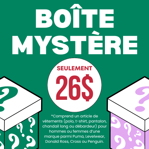 Comprend un article de vêtements (polo, t-shirt, pantalon, chandail long ou débardeur) pour hommes ou femmes d’une marque parmi Puma, Levelwear, Donald Ross, Cross ou Penguin.